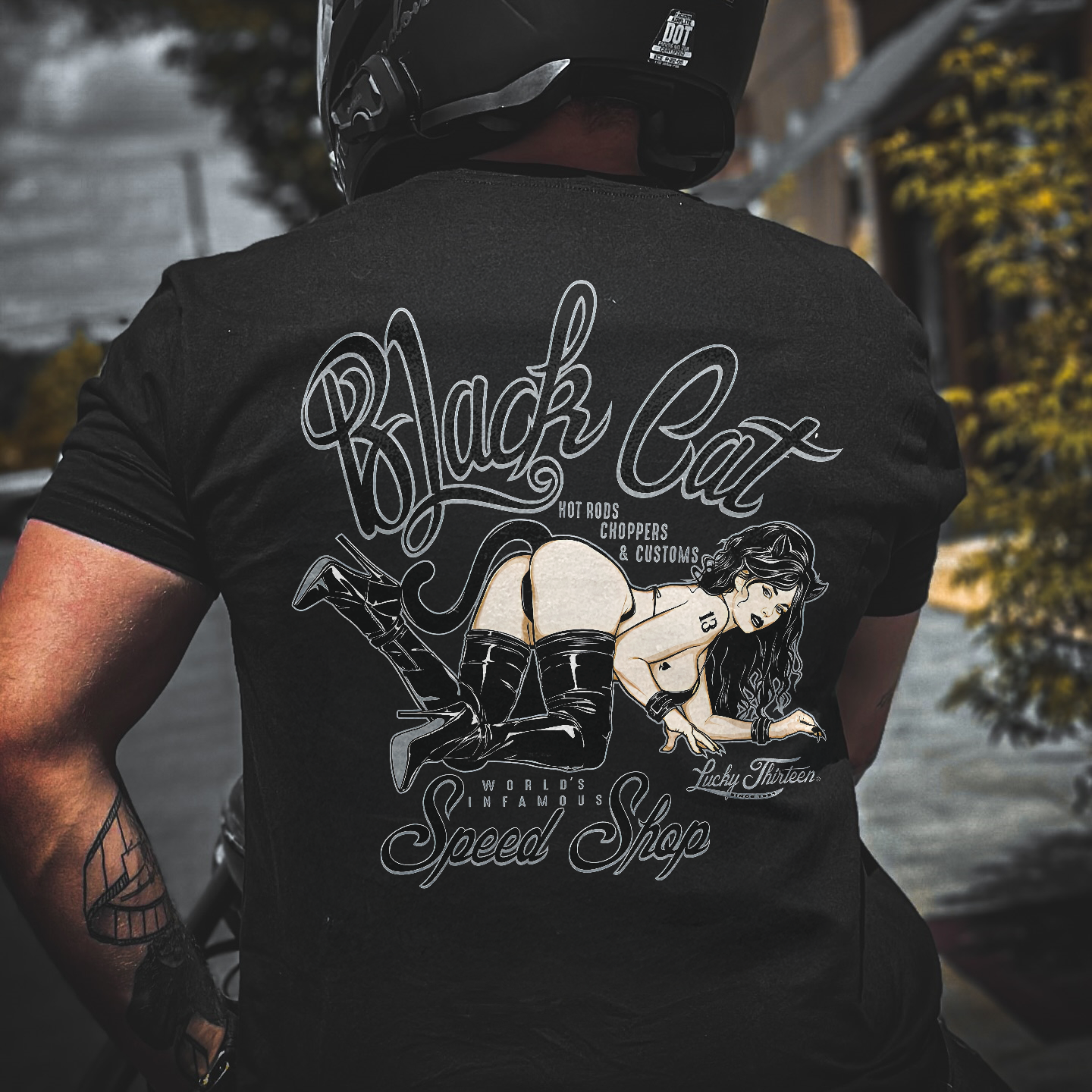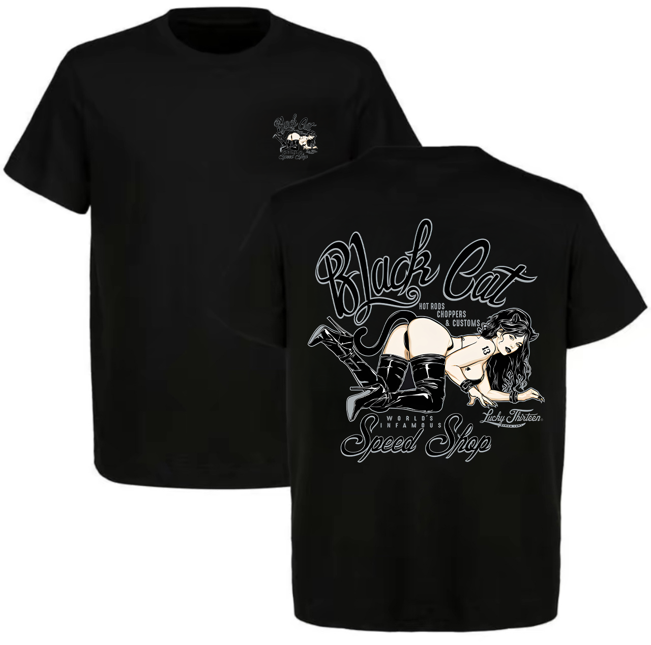 Black Cat Hot Rods Choppers & Customs Worlds Infamous Speed Shop Lucky Thirteen Printed Men's T-shirt