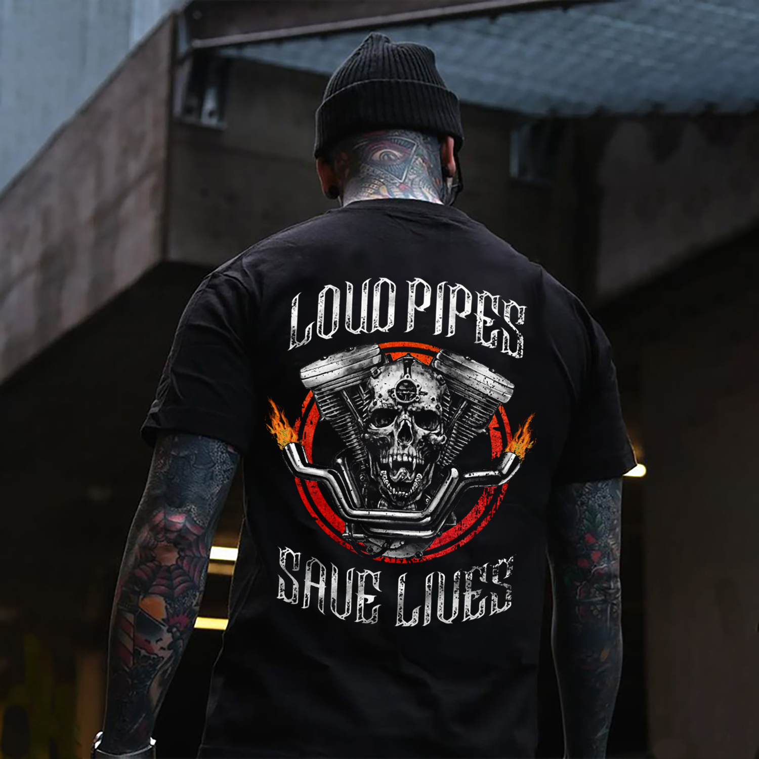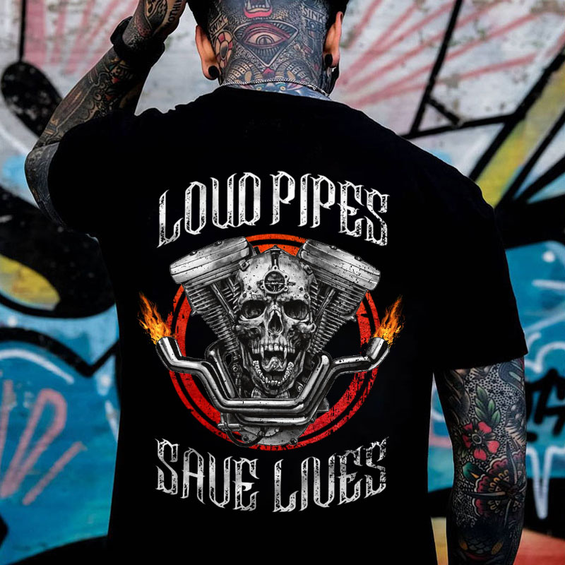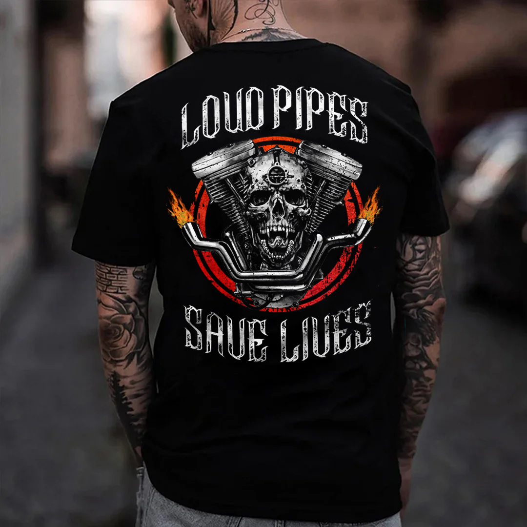LOUD PIPES SAVE LIVES Skull Motor Black Print T-Shirt